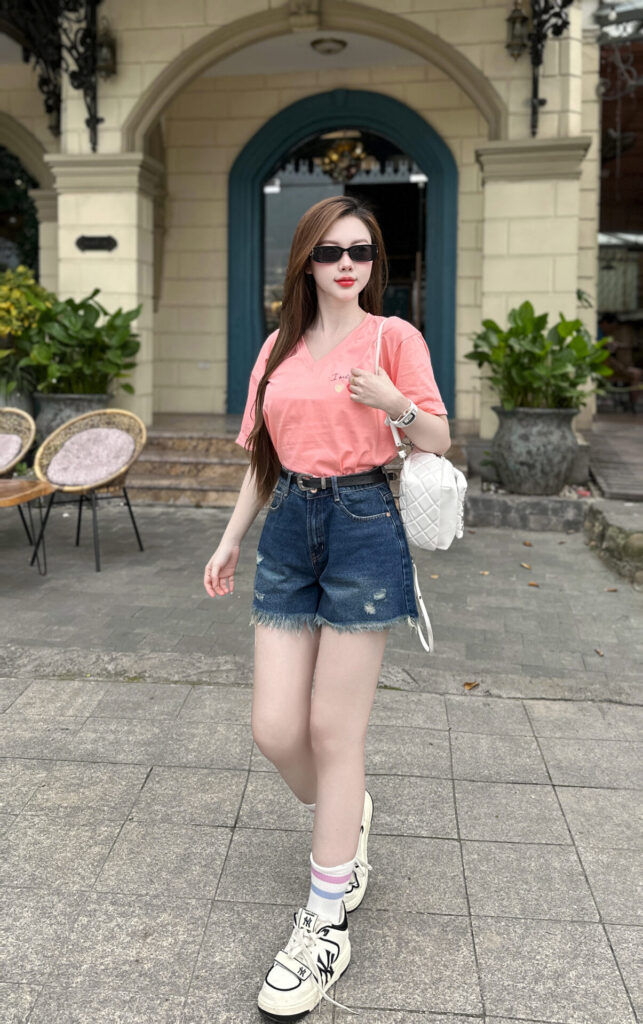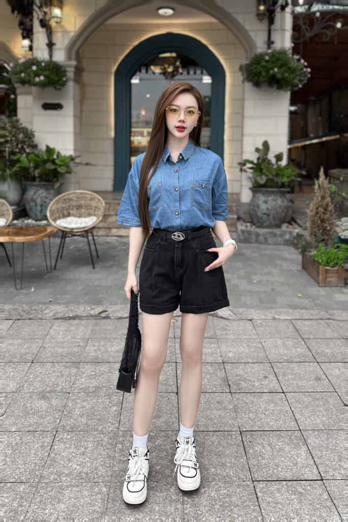 Phụ kiện đi kèm gợi ý: một đôi sneaker trắng hoặc sandal quai mảnh, túi đeo chéo mini, mắt kính mát để tăng thêm phần sành điệu. Bạn cũng có thể khoác thêm áo sơ mi mỏng hoặc áo khoác denim bên ngoài nếu cần lịch sự, kín đáo hơn.